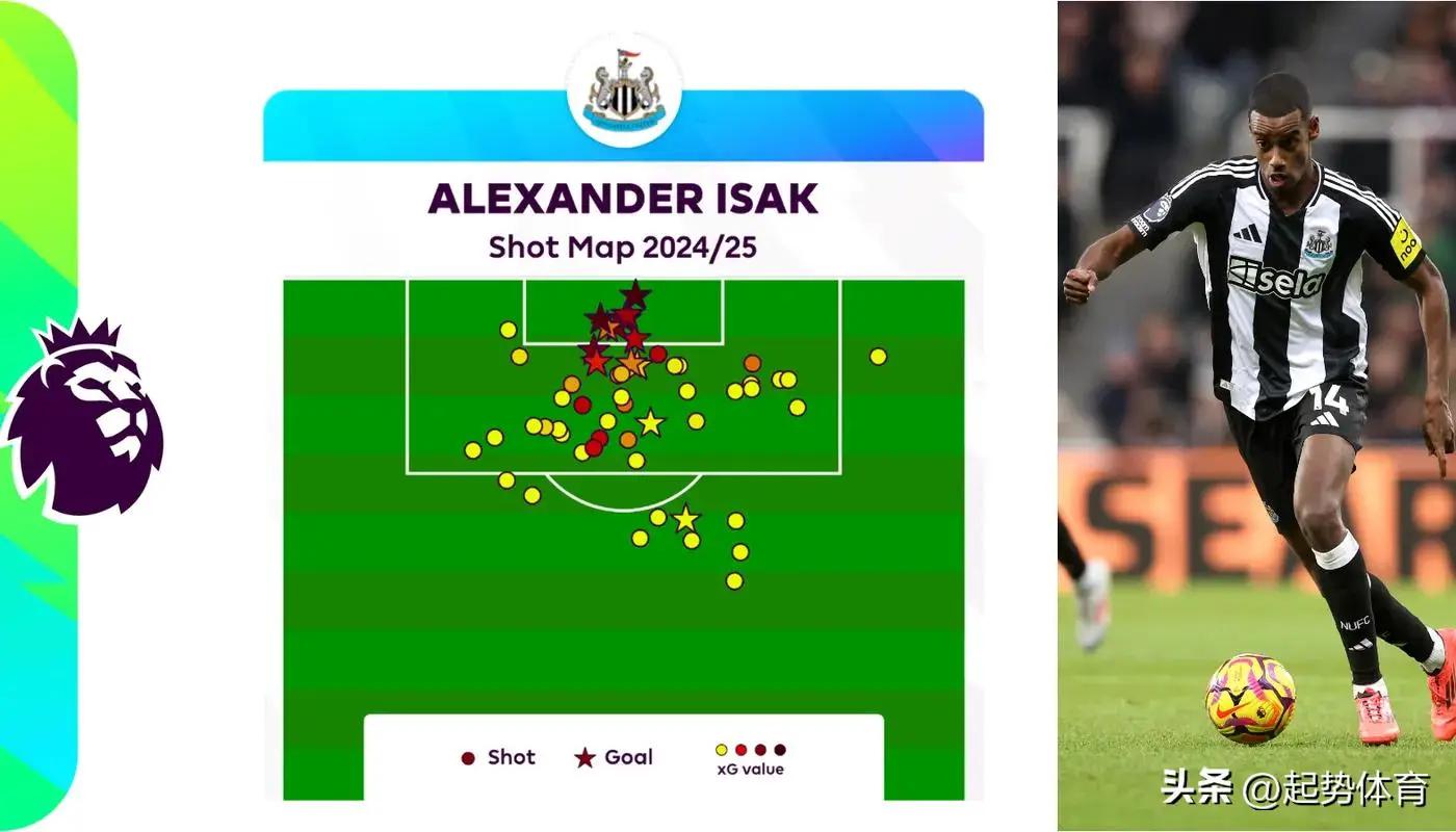 伊萨克在球场的这个区域打进了 13 个进球中的 7 个,远远超过萨拉赫(3 个)、哈兰德(2 个)、帕尔默(1 个)和姆贝莫(0 个),伊萨克非常擅长在六码禁区内的落点。