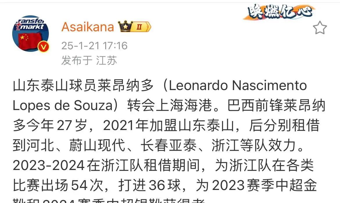 即使表现出色,放在其他中超球队,都会立即被召回投入比赛阵容。唯独山东泰山队不断兜售莱昂纳多,原本看好他的浙江队也无奈让给了引援意欲极强的上海海港队。泰山队从转会中获得一定费用,而海港则得到了一名高效射手。莱昂纳多有望在新的球队中继续发挥出色,进球较为轻松。但这次转会是否有避免转会至直接竞争对手的条款,目前尚不得而知。如果没有,泰山队的这笔交易就未免有些失算。