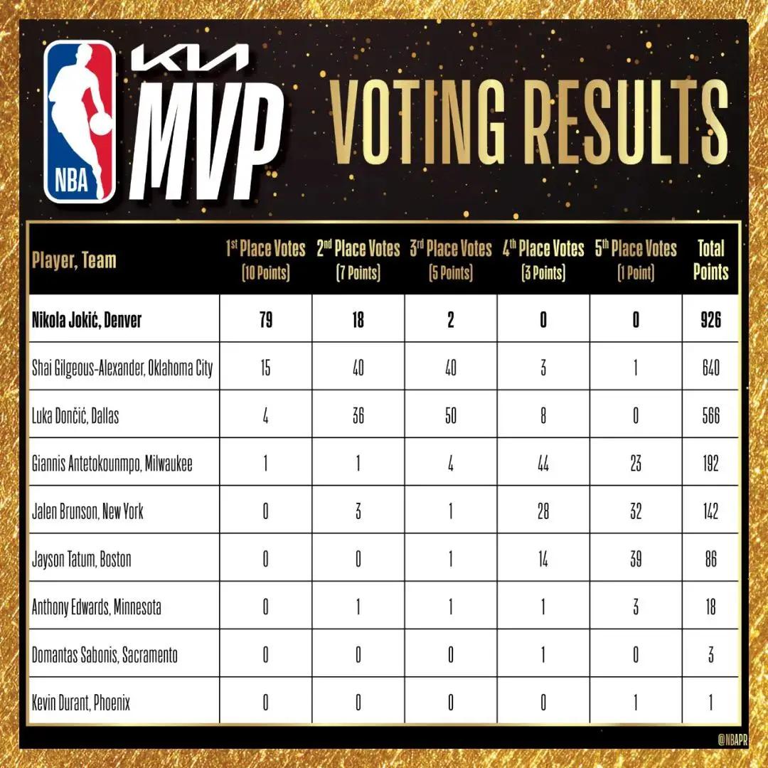 雷霆首发:亚历山大、吉迪、多尔特、杰伦-威廉姆斯、霍姆格伦。今年季后赛,雷霆5胜0负还没输过。别忘了,常规赛雷霆可是西部第一。约基奇当选本赛季常规赛MVP,他得到79张第一选票。亚历山大第二,东契奇第三。