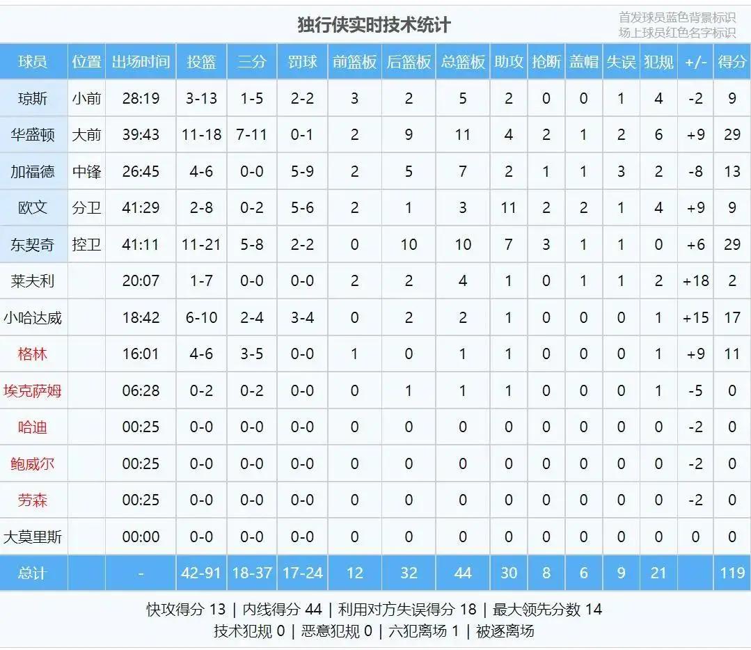 2分12秒,华盛顿6犯离场。他的数据定格在29分11篮板4助攻2抢断1盖帽,三分球11投7中,东欧的最强帮手就是他!雷霆三分不开,一直落后10分左右。比赛结束,独行侠119-110战胜雷霆,总比分1比1平,独行侠三分37中18!