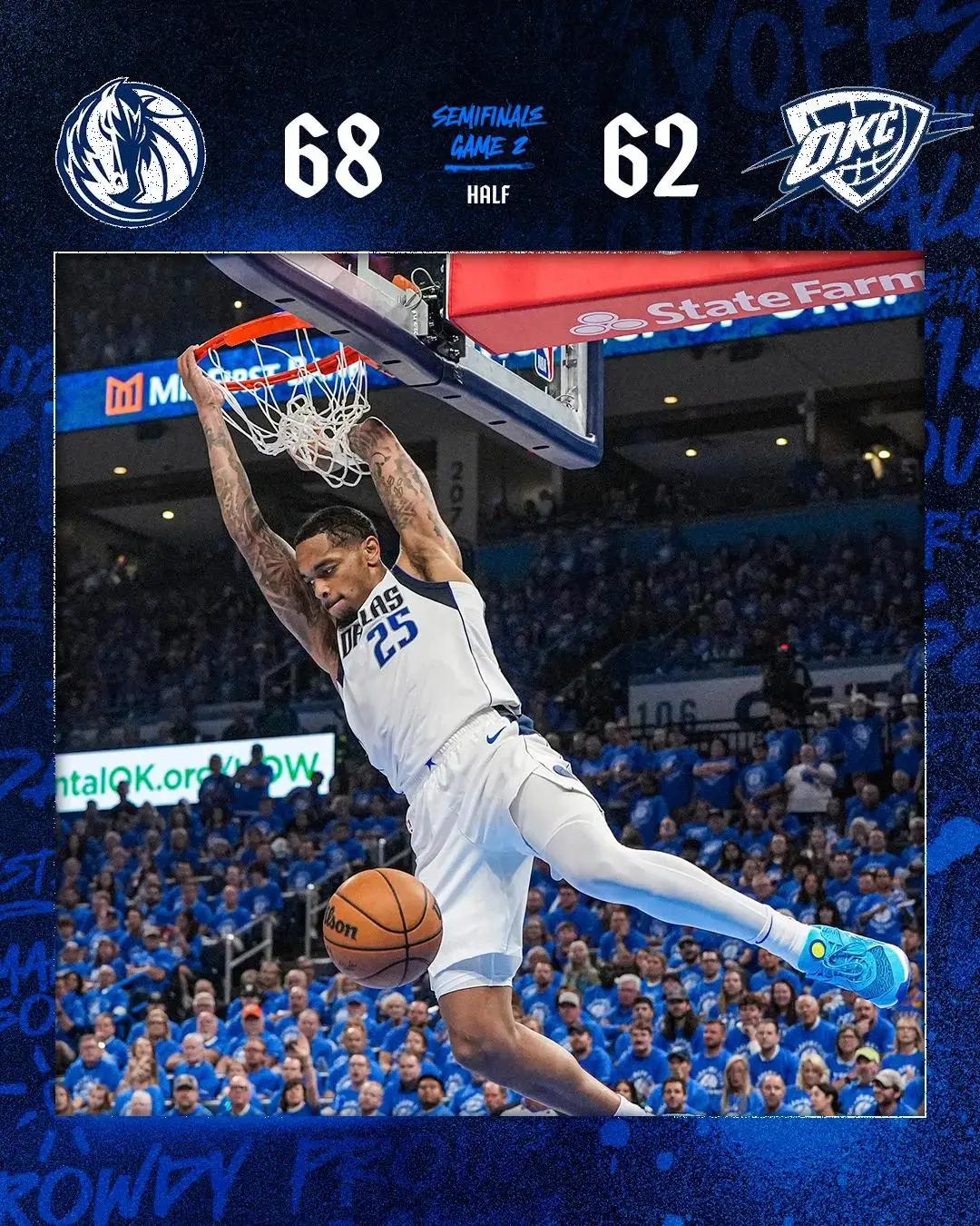 雷霆的防守很有意思,第二节坚决夹击东契奇和欧文,让独行侠其他球员投三分。华盛顿继续在外线开炮,独行侠2分半打出9-0,领先到两位数。雷霆太坚韧了,亚历山大率队不断追分,东契奇次节出手机会不多,单节3中1仅得2分。
