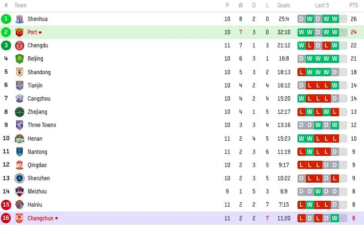 成都蓉城比沪上双雄多赛1场,排在第三。保级方面,长春亚泰经历惨败过后重回垫底的位置,青岛海牛排名倒数第二。