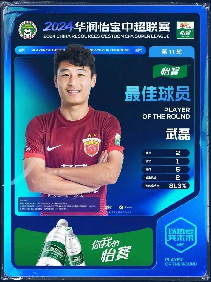 恭喜我们的7号武磊获评2024华润怡宝中超联赛第11轮最佳球员,这也是他本赛季第4次当选单轮最佳球员!