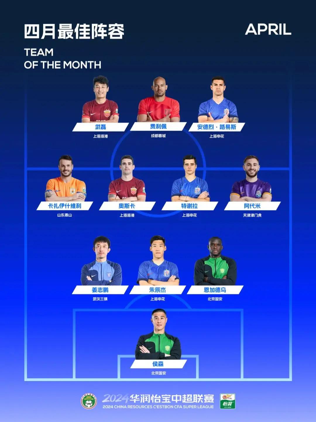 4月中超最佳阵容也正式公布。最佳阵容采用了3-4-3阵型。除了最佳门将侯森之外,后防线上入选的3人分别是武汉三镇后卫姜至鹏、上海申花后卫朱辰杰和北京国安后卫恩加德乌。中场4个位置全部由外援占据,包括山东泰山球员卡扎伊什维利 、上海海港队长奥斯卡 、上海申花球员特谢拉和天津津门虎球员阿代米。锋线上除了联赛头号射手武磊领衔之外,另外两个位置则由上海申花前锋安德烈·路易斯(4球3助)以及成都蓉城前锋费利佩(6球1助)占据。