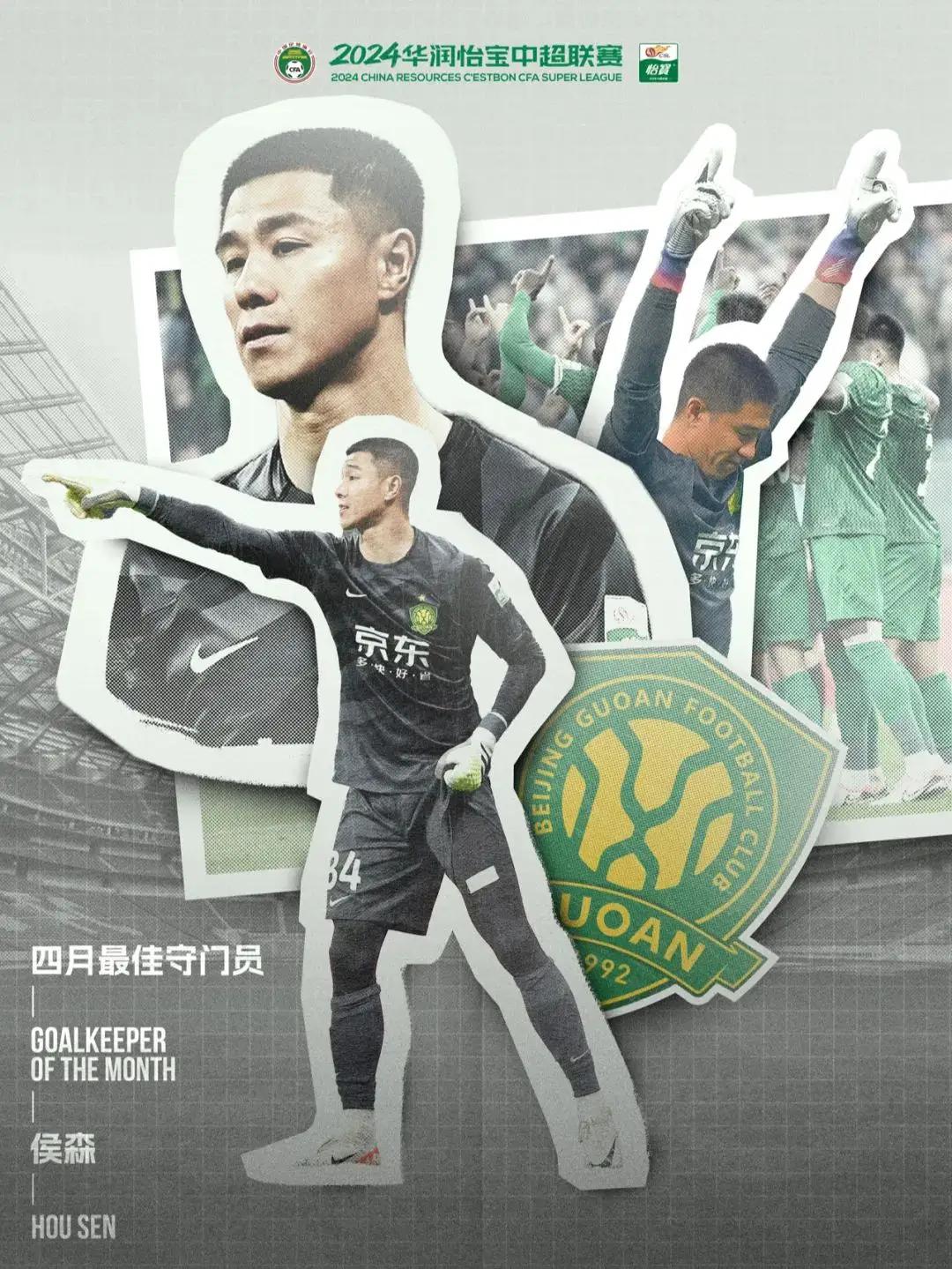 在4月的中超联赛中,北京国安取得3胜2平1负的战绩。国安门将侯森所把守的球门在他6场比赛中被射正33次,他扑出了其中的26次射门,是扑救成功次数最多的门将,扑救成功率排名第三。此外侯森在第8轮客场2比1击败浙江俱乐部的比赛中,还扑出了对手的一记点球。