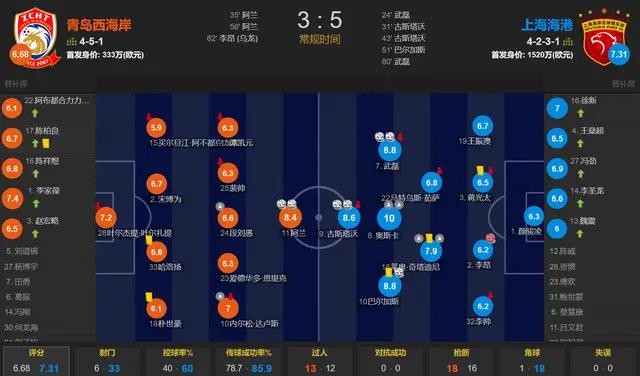 最终,上海海港客场5-3青岛西海岸,近4轮中超轰出21球,场均>5球,进攻恐怖如斯;上海海港少赛1场排名第二,青岛西海岸排名第十。