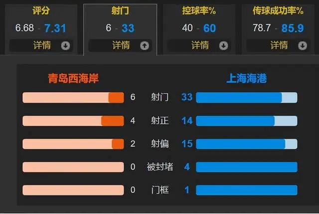 全场比赛,上海海港的控球率为六成,一共有33次射门,其中14次射正;青岛西海岸一共有6次射门,其中4次射正。