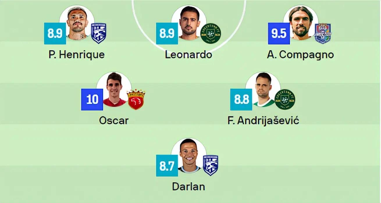 本轮比赛,外媒《sofascore》评选的最佳阵容,中前场全部被外援占据。锋线上,1射1传帮助武汉三镇3-2河南队的恩里克,完成梅开二度帮助浙江队5-2南通支云的莱昂纳多,帽子戏法助天津津门虎4-2沧州雄狮的孔帕尼奥3名球员一字排开。中场位置,贡献2助12次关键传球的上海海港中场核心奥斯卡以10分满分领衔,与浙江队1射2传的费兰克出任中前卫,来自武汉三镇的达兰门德斯出任单后腰。
