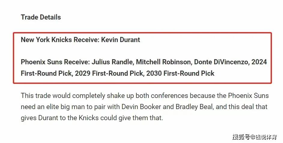 尼克斯送出兰德尔+米罗+迪文琴佐+2024年首轮签+2029年首轮签+2030年首轮签得到太阳的杜兰特