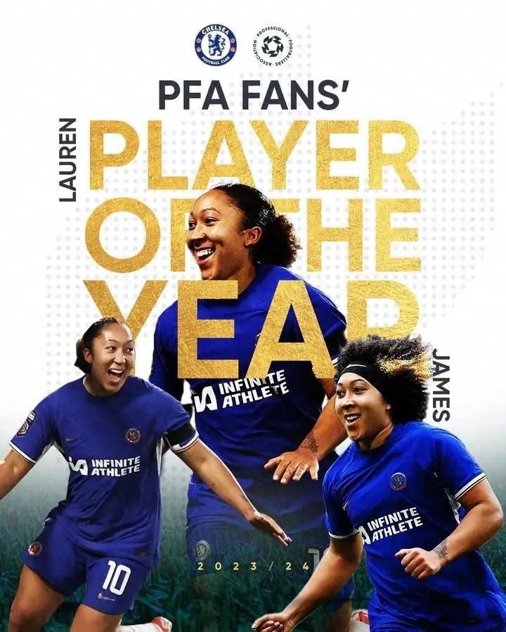 直播吧5月22日讯 英格兰职业球员协会(PFA)宣布,劳伦-詹姆斯被球迷评为2023-24赛季女子英超年度最佳球员。