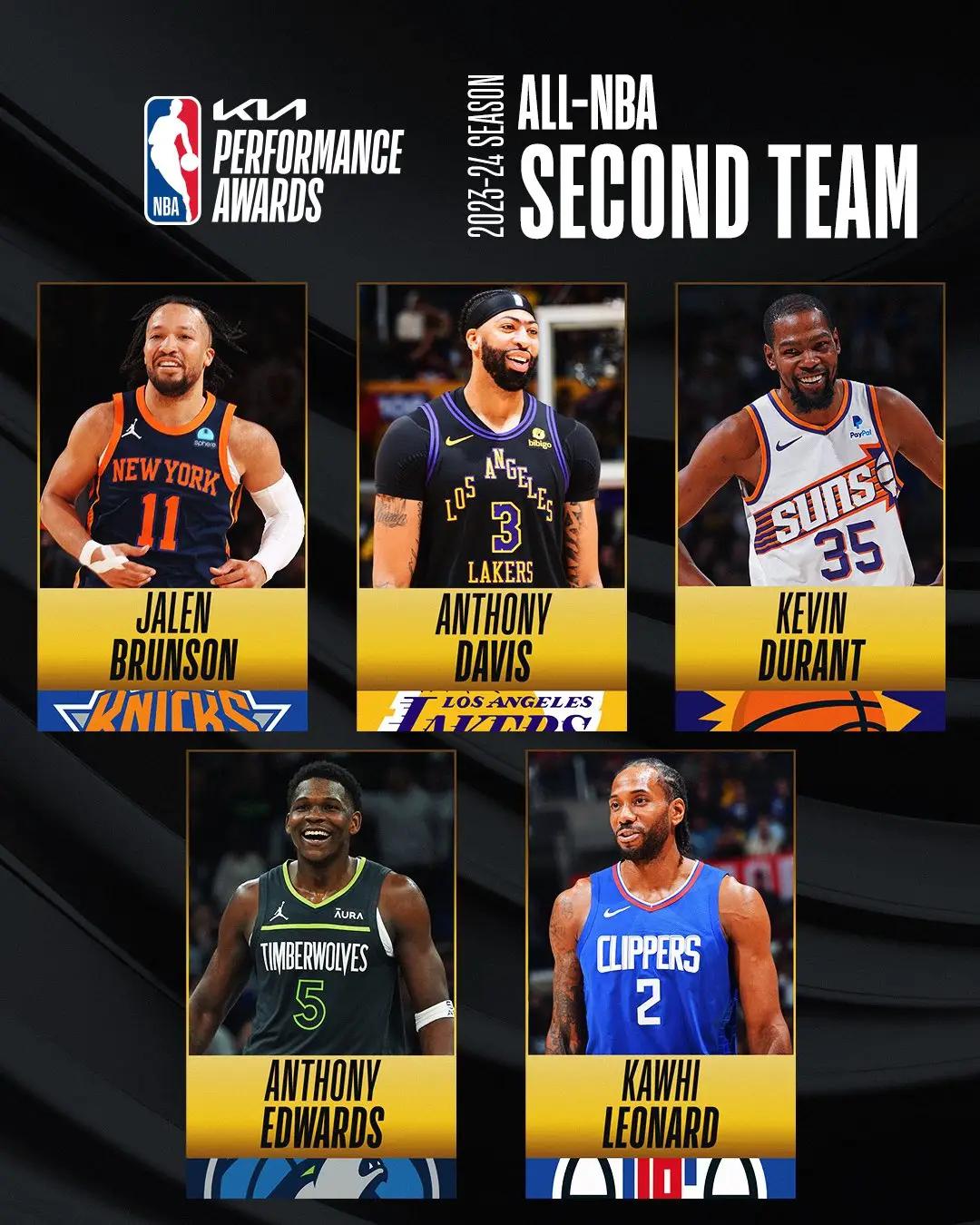 最佳阵容二阵:杜兰特、伦纳德、AD、爱德华兹、布伦森。
