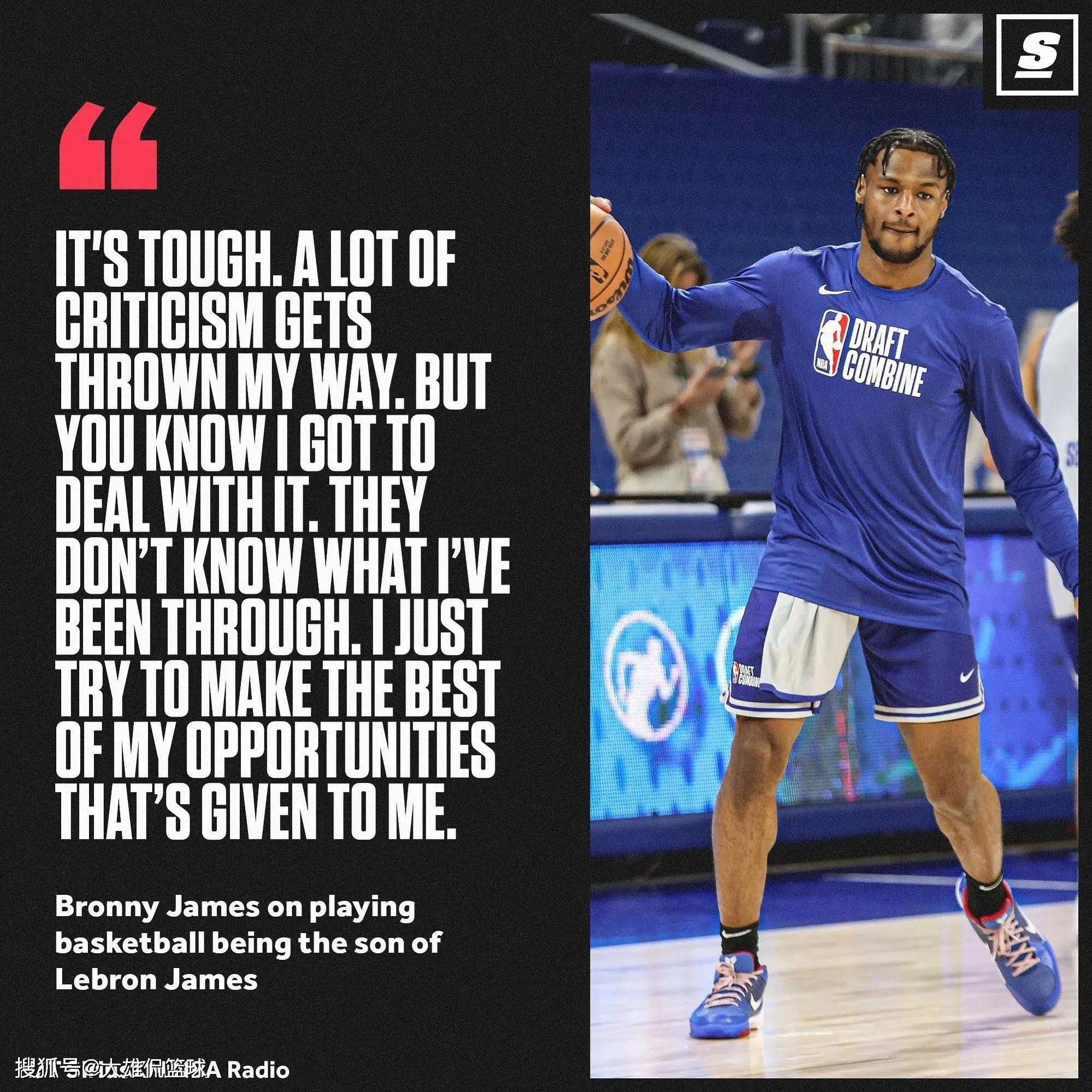 勒布朗詹姆斯表达了他对成年人对布朗尼詹姆斯追求NBA梦想的否定,感到非常沮丧和怀疑。勒布朗詹姆斯认为外界应该给予布朗尼詹姆斯,更多支持和赞美。