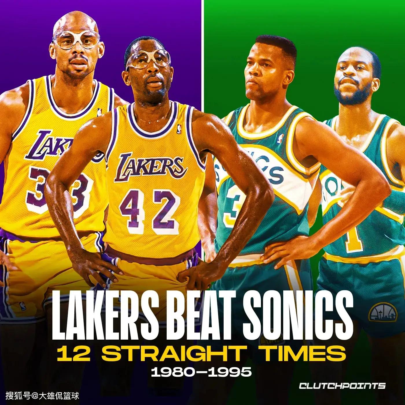 洛杉矶湖人从1980年到1995年的季后赛,在面对西雅图超音速的时候,连续12次击败对方。洛杉矶湖人当时传统豪门强队,曾在80年代打造了属于自己王朝,进入90年代后,魔术师约翰逊因为艾滋病退役,湖人就此没落了几年。
