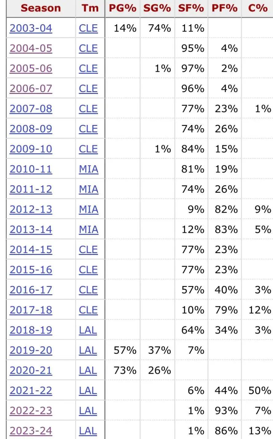 你看看,詹姆斯又刷新了一项历史纪录。能够进入该项纪录的讨论标准是,任意位置在任意赛季的出场时间都要超过50%以上,詹姆斯打得最少的位置是中锋,他在2021-22赛季50%的时间都是打中锋,刚刚好。