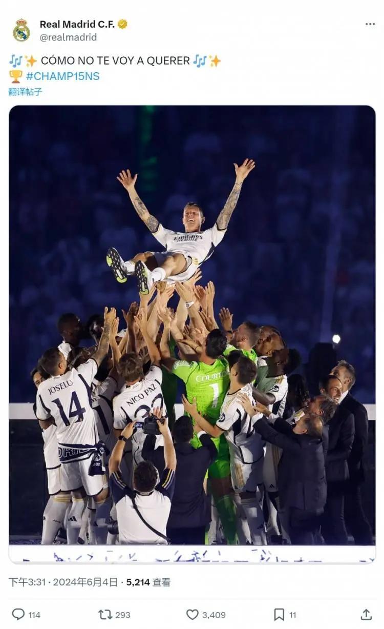 克罗斯将在欧洲杯后退役,效力皇马的最后一个赛季,他帮助球队赢得西甲冠军和欧冠冠军,在欧冠决赛之后,这位34岁的德国中场被队友们抛在空中,皇马官方社媒晒出照片,并配文:“我怎能不爱你。”