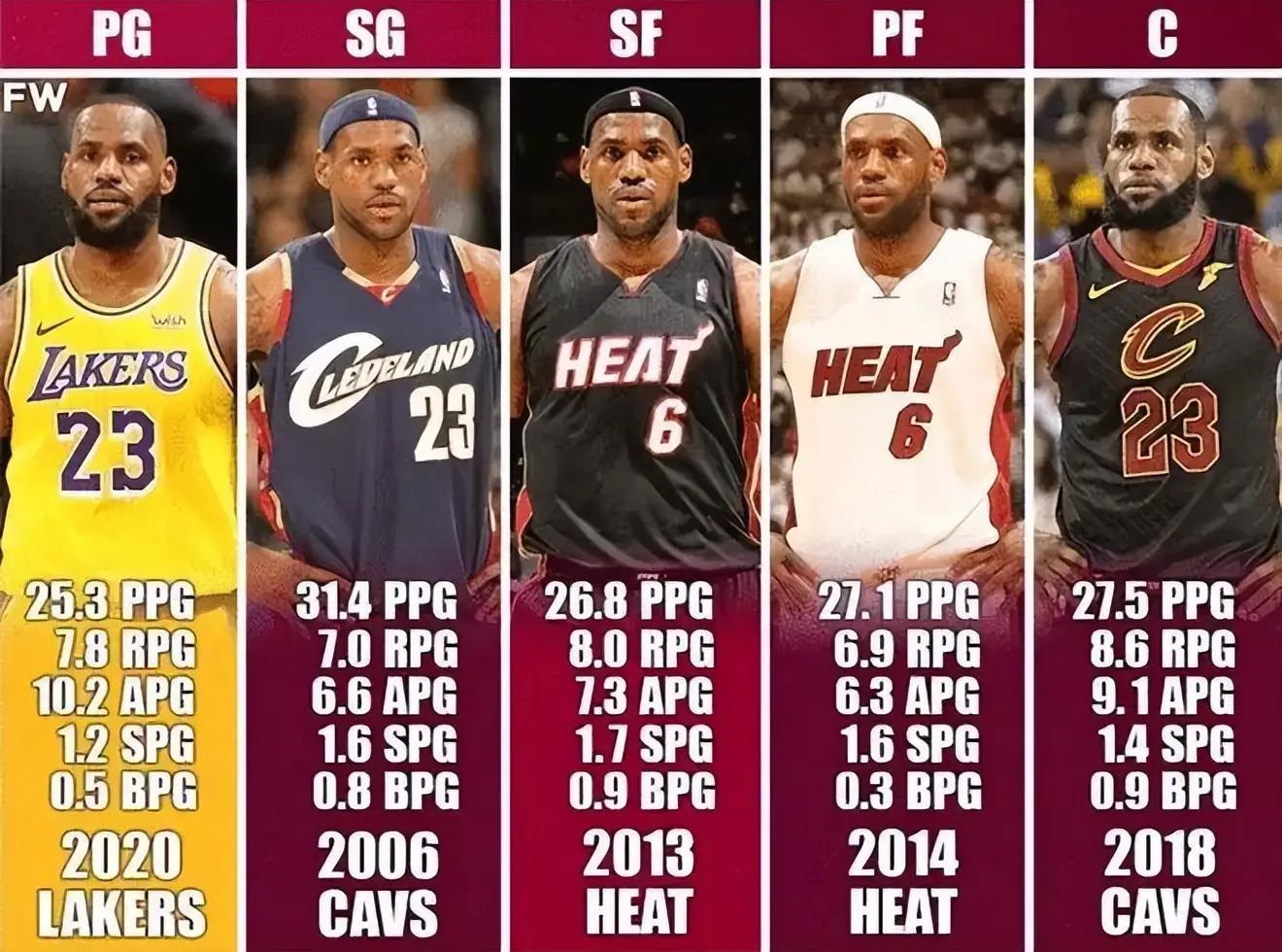作为NBA历史上唯一一个被官方标注为在职业生涯中打过所有五个位置的球员,詹姆斯在不同位置上都有着出色的表现,这是根据整个赛季所打的主要位置来计算的,在某个位置出战时间达到/超过总时间50%的才符合条件。