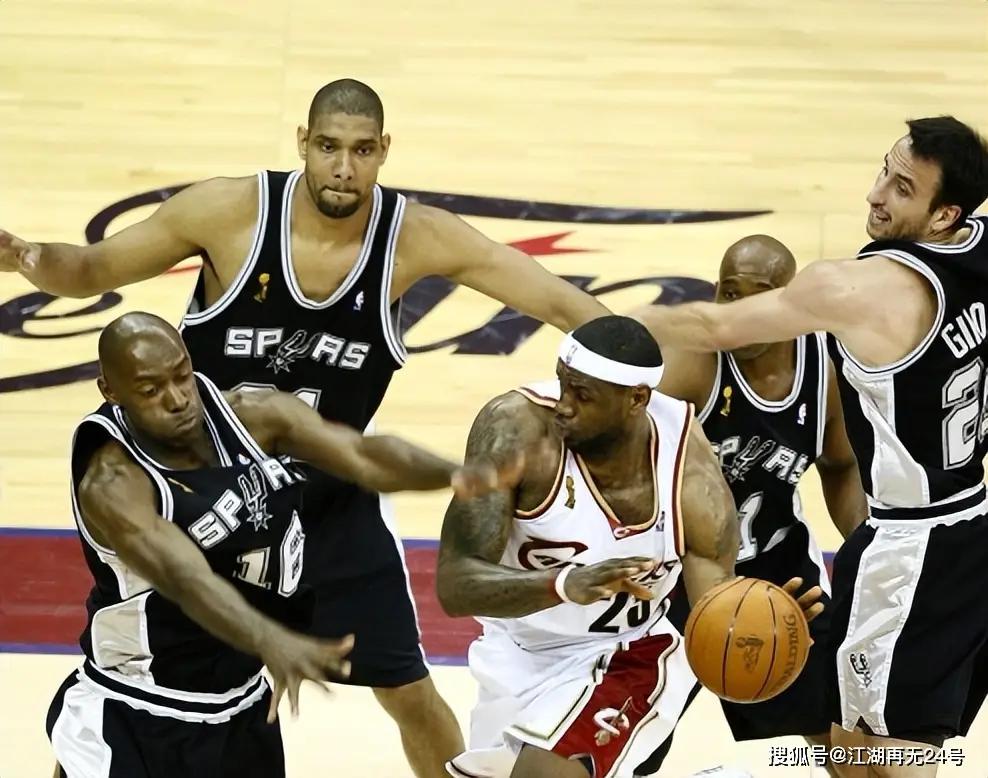 2007年总决赛G1,詹姆斯面临着的,是彼时已经连续7年入选最佳防守阵容顶级外线防守者布鲁斯-鲍文的贴防,过这一关已经要费不小的力气,布鲁斯-鲍文身后还有邓肯守在詹姆斯的突破路线上,其他马刺球员甚至在不少回合放掉自己的对位球员来协防,获得了不错的效果。