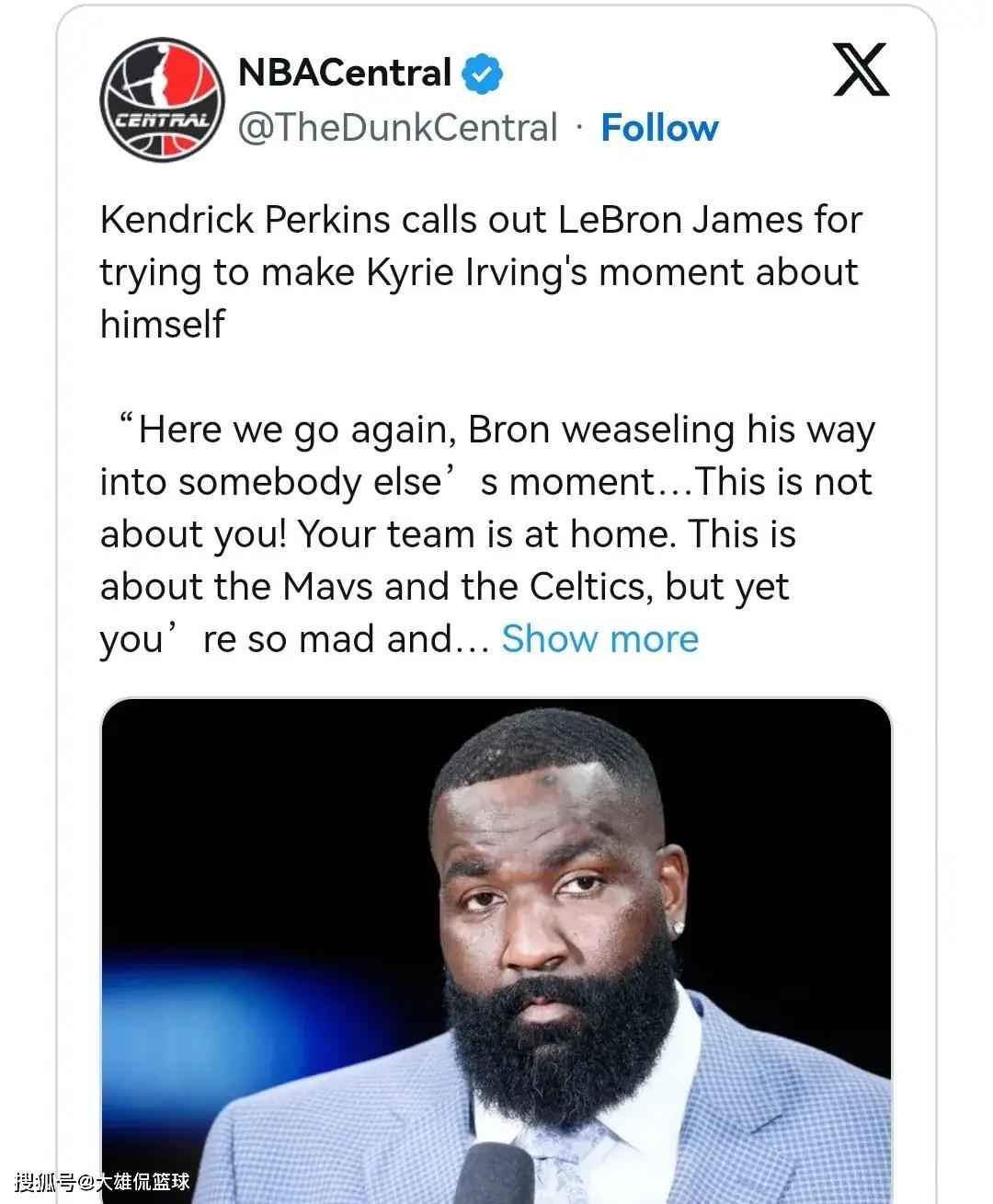 帕金斯“我们又来了,勒布朗詹姆斯用自己的方式进入别人的时刻,让别人享受它。这与你无关,你的球队在主场。这是关于小牛队和凯尔特人队的,但你对自己不再是凯里欧文的合作伙伴感到如此愤怒和失望。”