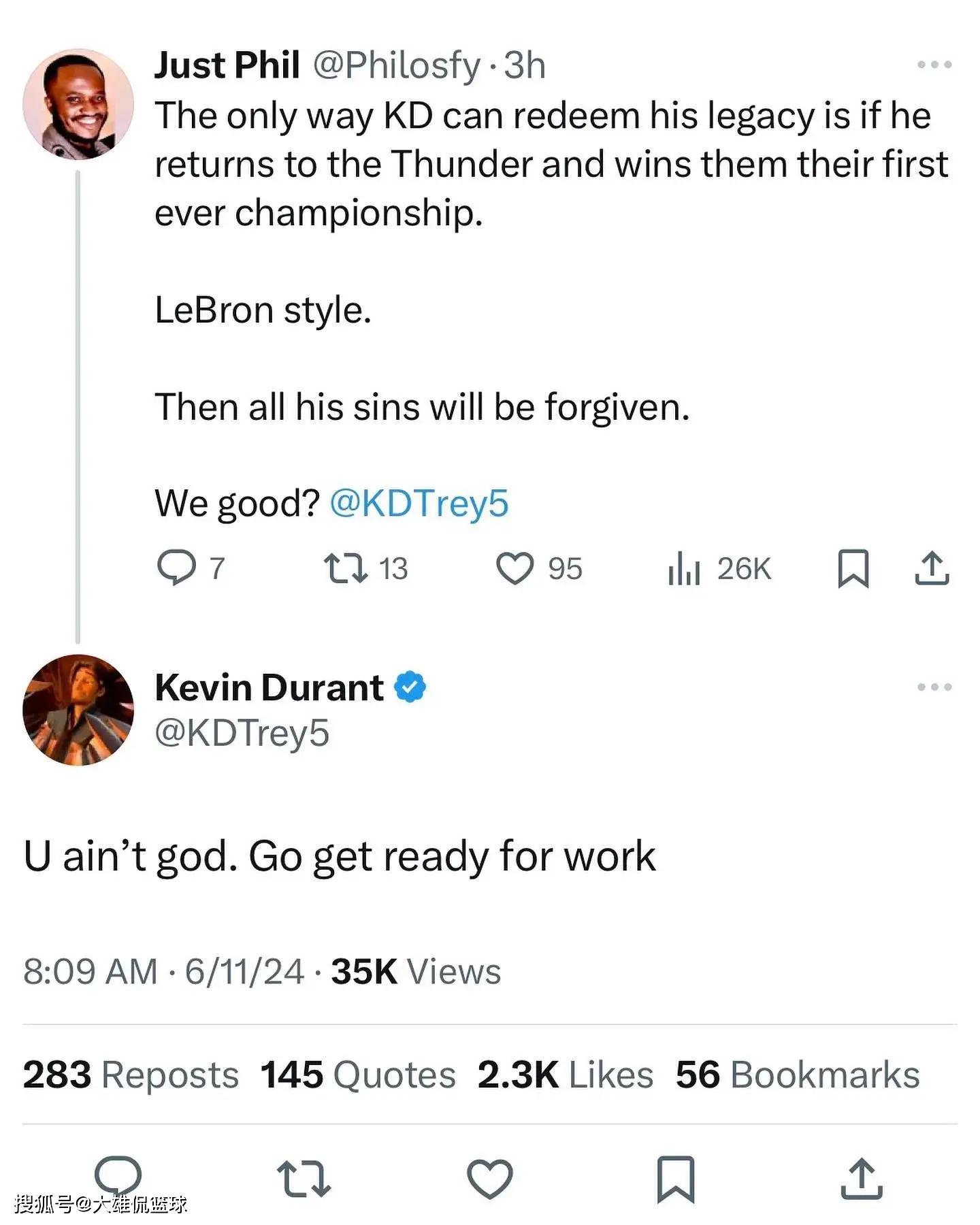 杜兰特发文回应道“你不是上帝。去准备工作”