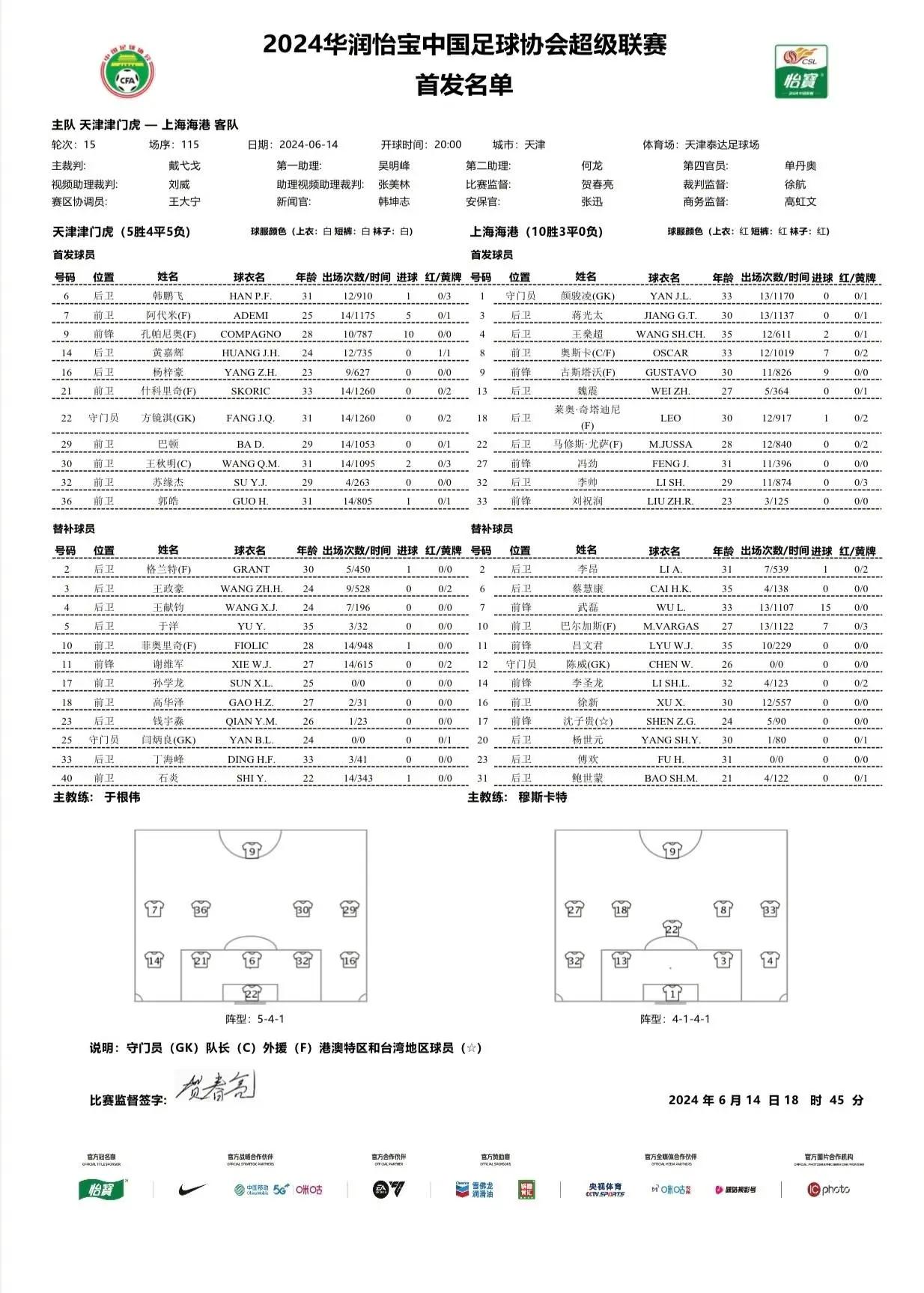 直播吧6月14日讯 北京时间20:00,中超第15轮,天津津门虎主场迎战上海海港,赛前双方公布首发阵容。