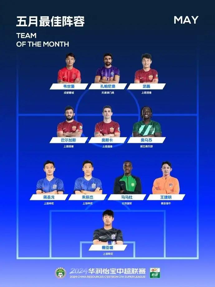 直播吧6月24日讯 中超官方公布5月最佳阵容,5月最佳阵容采用433阵型,韦世豪、孔帕尼奥和武磊搭档锋线,奥斯卡坐镇中场。