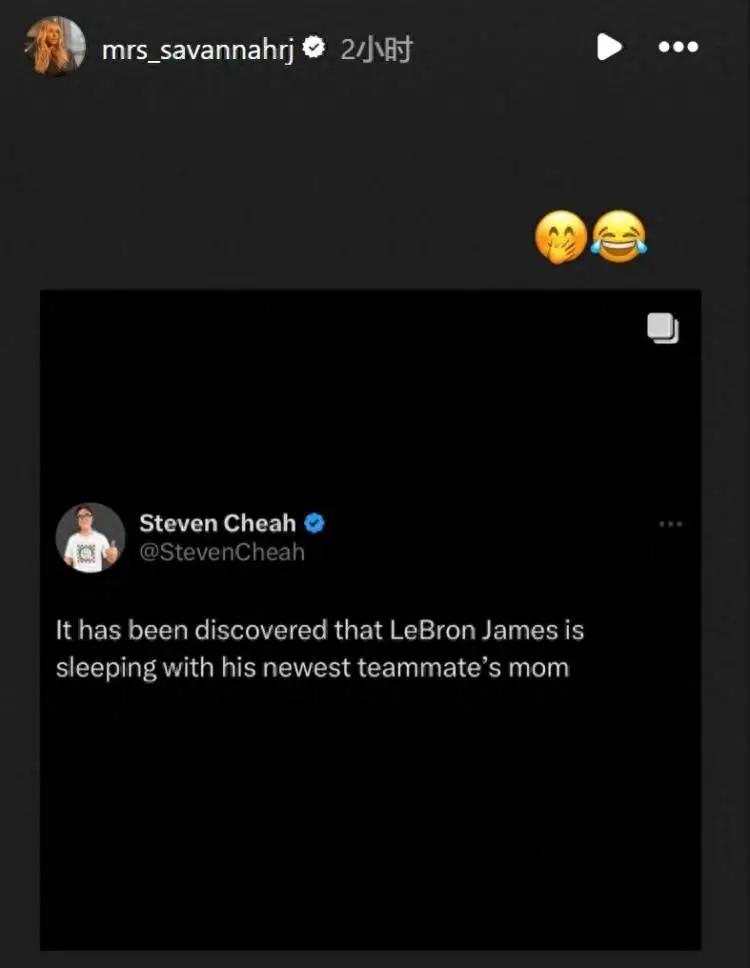 一网友评论道:“勒布朗-詹姆斯被发现正在与他最新队友的妈妈睡觉。”勒布朗-詹姆斯的妻子萨瓦娜在INS转发了此言论,并评论道:“??。”