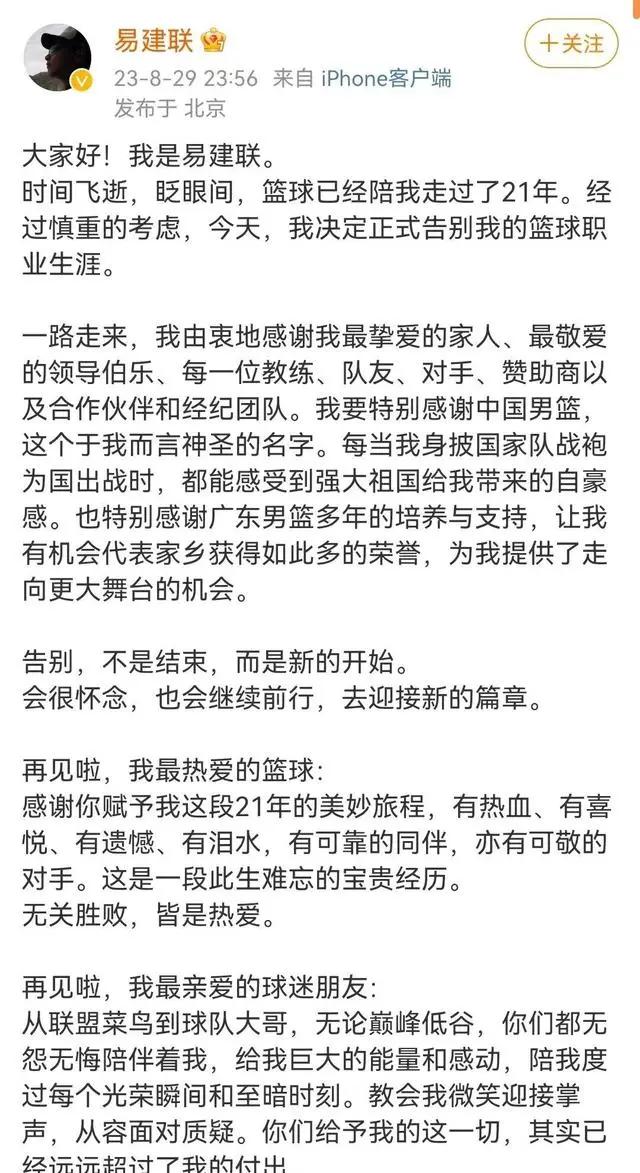 2023年8月29日,篮球巨星易建联发表深情告别声明,宣告他长达21年的篮球辉煌生涯正式落幕。他在文中感慨道:“感激篮球给予我这段无比珍贵的21年旅程,其中有热血沸腾的时刻,有欢笑与泪水交织的回忆,有并肩作战的伙伴,更有激励我们的对手。这段经历将永远镌刻在我心中。”