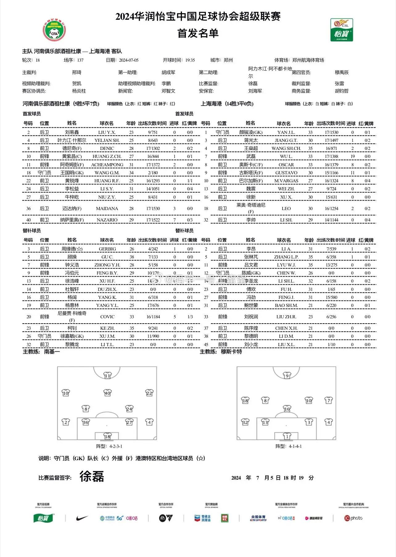 直播吧7月5日讯中超第18轮,河南vs上海海港的比赛将在19:35于郑州航海体育场准时打响,赛前首发阵容已经公布。