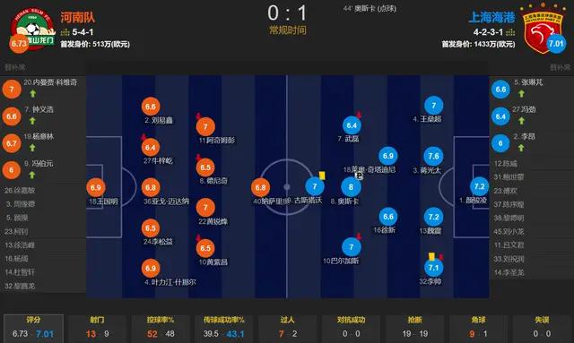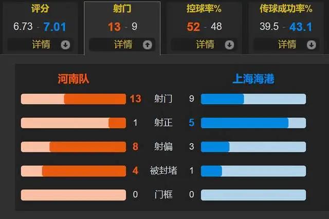 全场比赛,上海海港的控球率为48%,一共有9次射门,其中5次射正;河南一共有13次射门,其中仅有1次射正。
