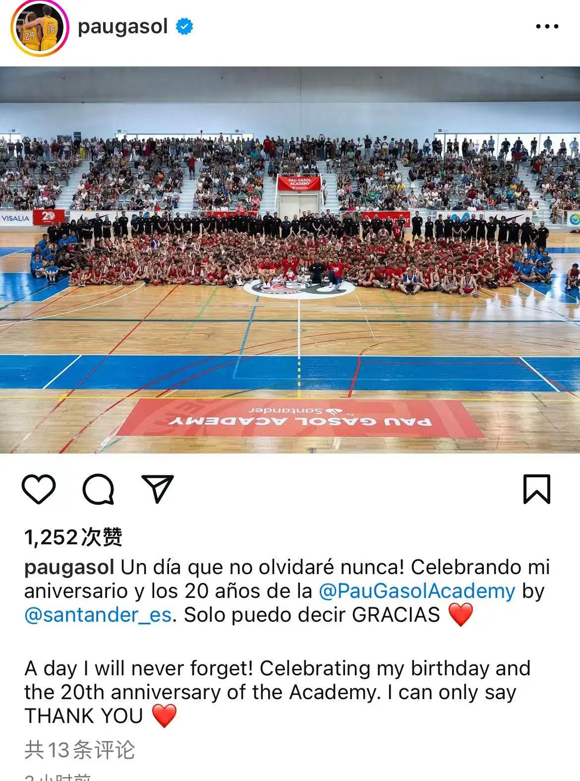 而在另外一条动态上,加索尔在球馆与这几名教练以及学员来了一张大合影,并且配文:“我永远不会忘记的一天,庆祝我的生日和学院成立20周年,我只能说谢谢。”