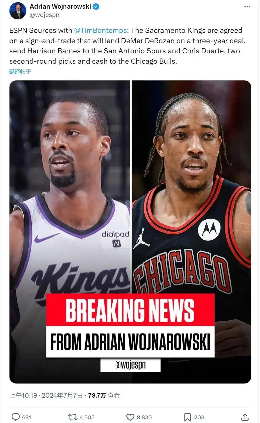 北京时间7月7日上午10点19分,一则重磅消息,据ESPN报道,德罗赞3年7600万美元加盟国王,其中有200万美元是奖金!这是一笔先签后换的三方交易,详情如下: