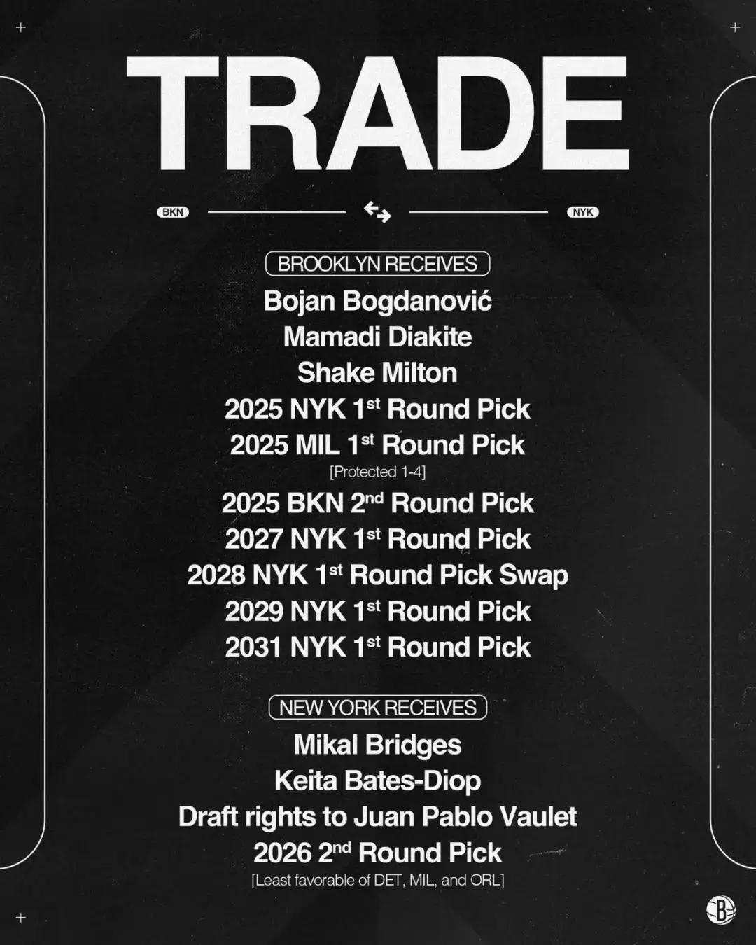 尼克斯得到米卡尔-布里奇斯、凯塔-贝茨-迪奥普、瓦莱特的签约权(2015年39号秀)、2026年次轮签(魔术/雄鹿/活塞当中顺位最低的)。