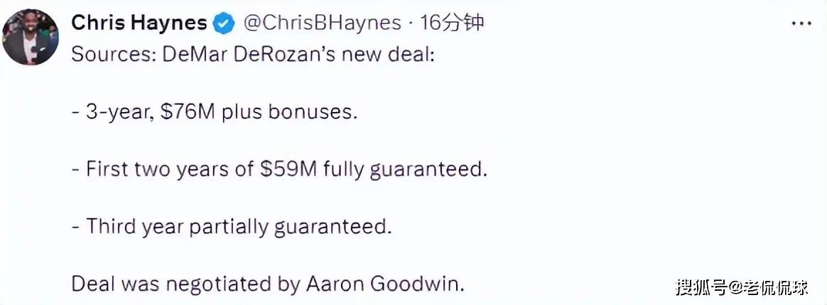根据之前美媒ESPN名记Shams的报道,公牛、马刺以及国王队完成三方史诗级大交易,德罗赞通过先签后换的方式,以3年7600万美金的续约合同加盟国王队,作为交易筹码,哈里斯-巴恩斯被送到马刺,联手文班亚马冲击季后赛,具体交易信息为: