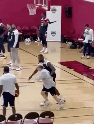 有个画面很喜感,小范甘迪教练持球绕掩护,亲自指导如何防守站位,詹姆斯防得很认真。