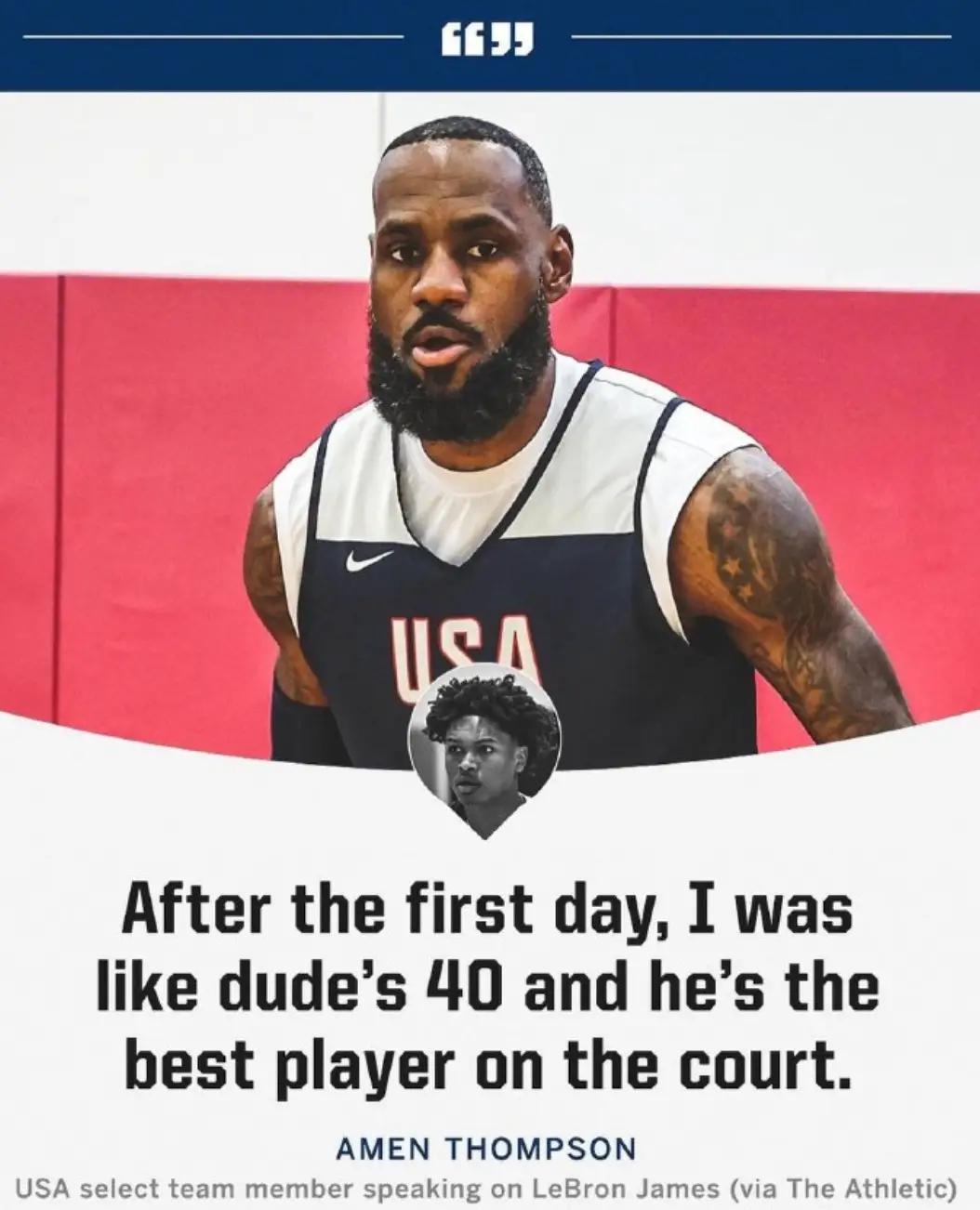 作为美国男篮选拔队的一员,火箭球员阿门·汤普森谈到了詹姆斯:“这就是我在第一天的训练结束后告诉我哥的,我的反应就像是,那位老兄(詹姆斯)都已经40岁了,他是球场上最好的球员。”