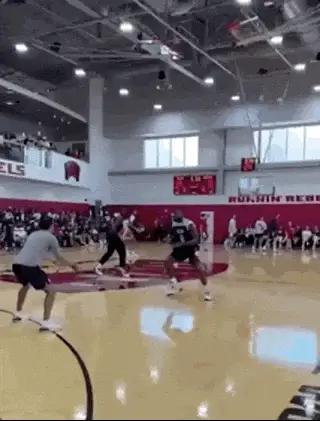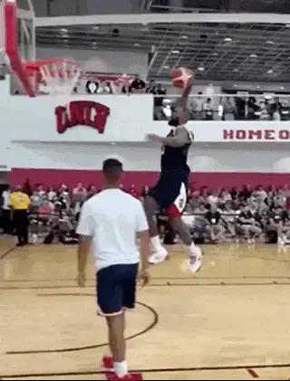 这老头子也是玩嗨了,训练的间隙,看到场边坐满了观众,他就各种秀扣篮,篮筐都要被他砸坏。