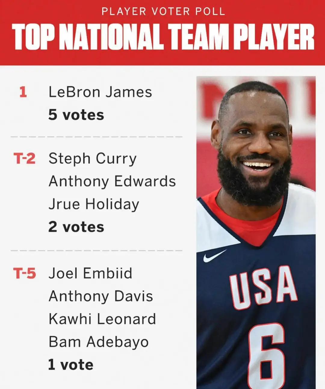 今日,美国男篮训练营公布了最佳球员的投票,詹姆斯以5票的数量飙到第一,成为美国男篮的最佳运动员。