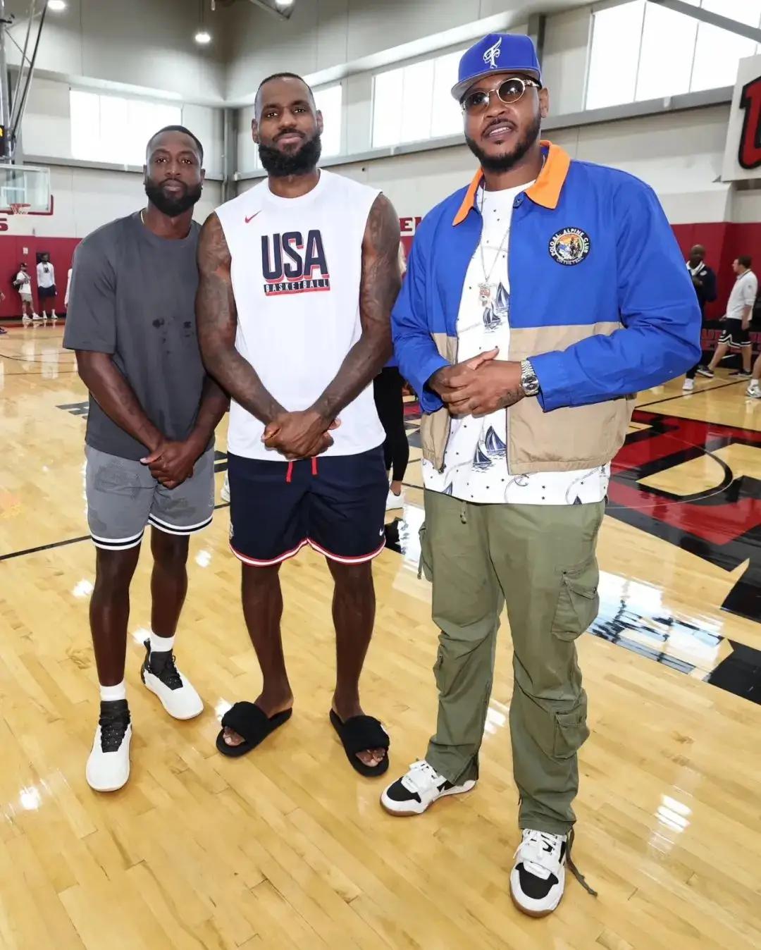 今天我们又看到久违的香蕉船三巨头组合,韦德跟甜瓜前来探班助阵了,观看了美国男篮的对抗赛,并跟詹姆斯留下了合影。