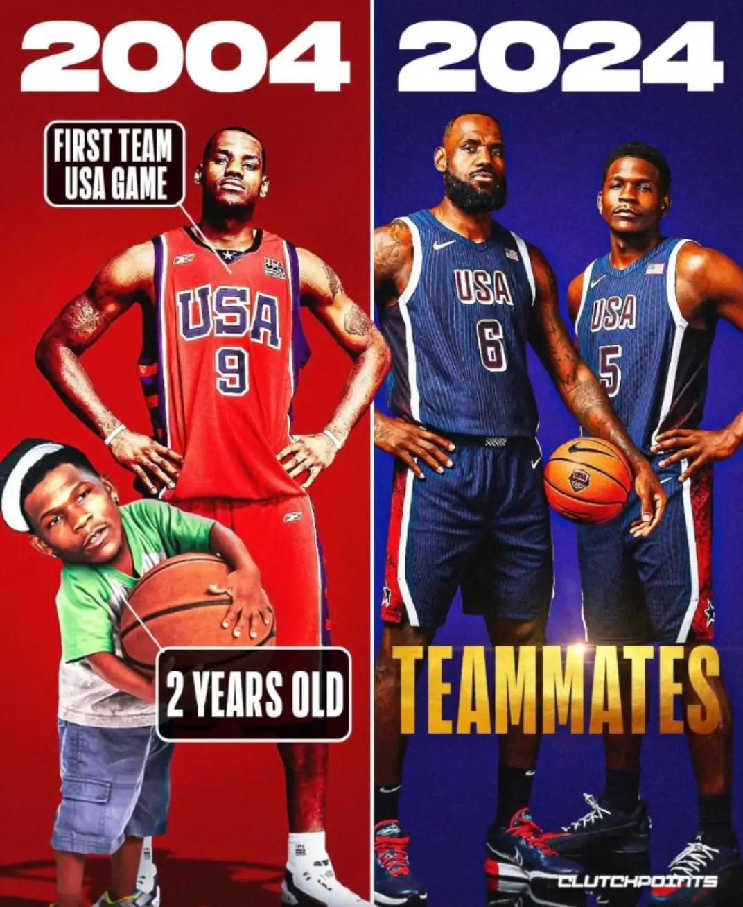 一个有意思的数据,2004年,詹姆斯作为二年级新秀,第一次代表美国队打奥运会,爱德华兹才两岁。如今他俩是队友。