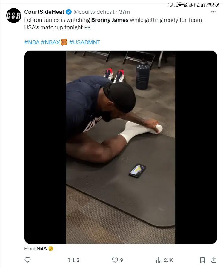 勒布朗-詹姆斯在为对阵加拿大的比赛热身,可他热身时都不忘看儿子的直播,可看这场比赛他应该会失望吧。