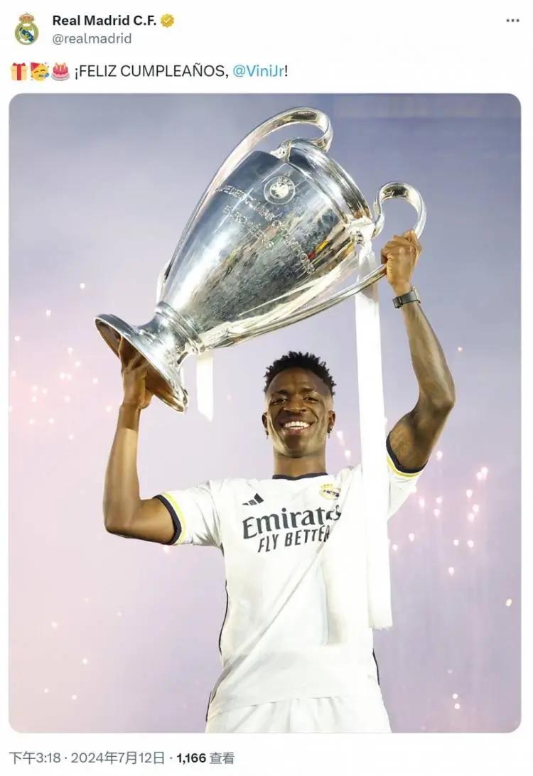 皇马官方账号在社交媒体上晒出维尼修斯捧起欧冠奖杯的照片,并写道:“生日快乐,维尼修斯!”
