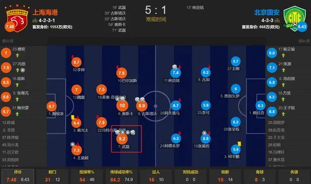 此役可是北京国安先动手的哦。比赛第13分钟,张稀哲助攻林良铭打破场上僵局之后,就进入了上海海港的时间,进入武磊的表演时间。本赛季上海海港在新的外教慕斯卡特的执教之下,坚决高压逼抢,进攻行云流水并遍地开花,上海海港的进攻在中超是独一档的存在。北京国安动手之后,上海海港狂入5球,其中武磊杀疯了,一人独造4球,2射2传,预定本轮中超最佳球员;奥斯卡传射建功,古斯塔沃梅开二度。