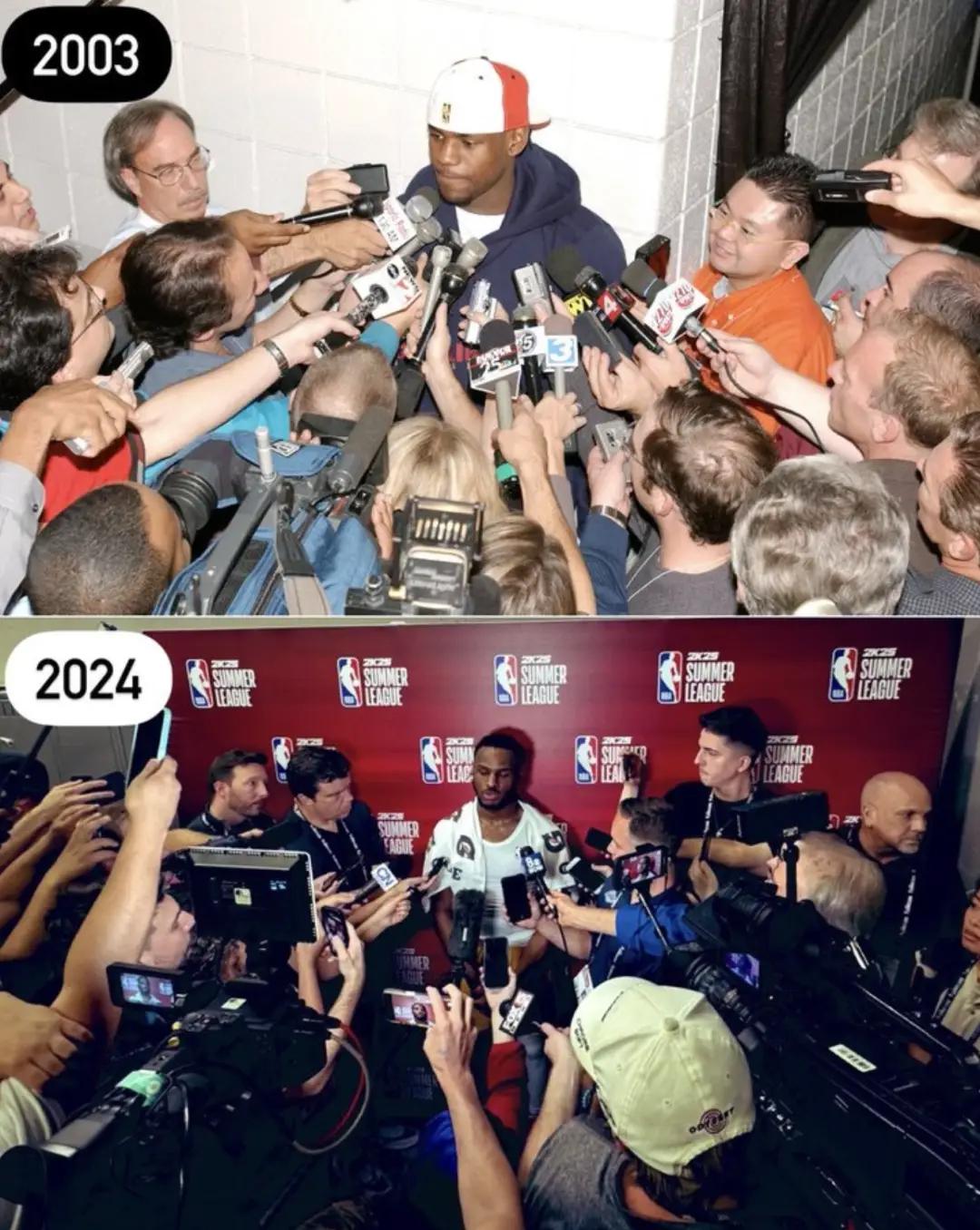 美媒今日对比詹姆斯和布朗尼在夏季联赛接受采访时的场景,都是长枪短炮,围得水泄不通。
