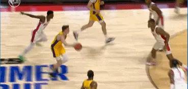 这个突破很坚决,还是不错的。现在他的打法有点畏手畏脚了,不太敢冲击内线,需要多增加一些突破得分的方式。