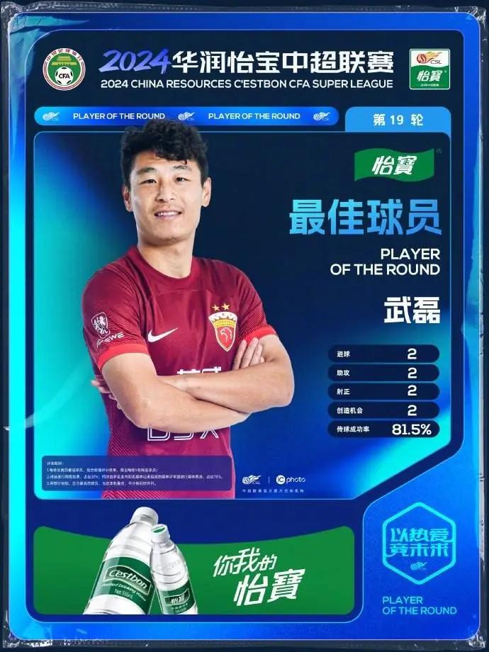 在第19轮官方最佳球员评选中,武磊媒体评审环节获得10张第一顺位选票,以60分排名第一;球迷投票环节,武磊总票数排名第二积24分,最终以总分84分当选本轮最佳。