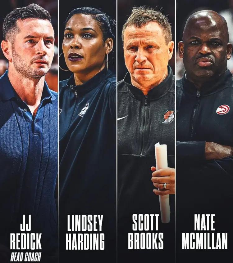 随后,美媒晒出目前湖人的教练组,分别是主教练雷迪克,助教哈丁、布鲁克斯、麦克米兰,如图: