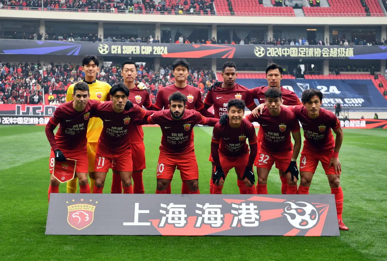 上海海港首发阵容:1-颜骏凌、2-李昂、5-张琳芃、22-马修斯-茹萨(F)、23-傅欢、32-李帅、8-奥斯卡(F)、10-巴尔加斯(F)、16-徐新、14-李圣龙、27-冯劲。