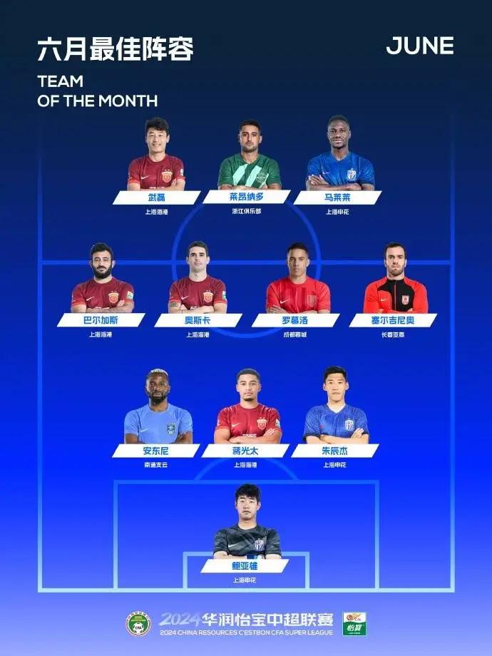 直播吧7月20日讯中超官方公布联赛6月最佳阵容,武磊领衔海港共4人在列,朱辰杰入选。