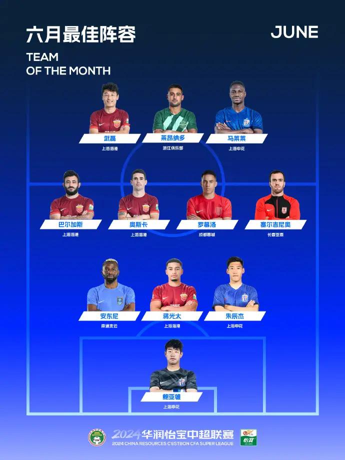 北京时间7月20日消息,今天中超联赛官方公布了联赛6月最佳阵容,目前已经取得12连胜的海港队共有包括武磊在内的4人在列,而申花队则有朱辰杰、马莱莱和门将鲍亚雄入选。