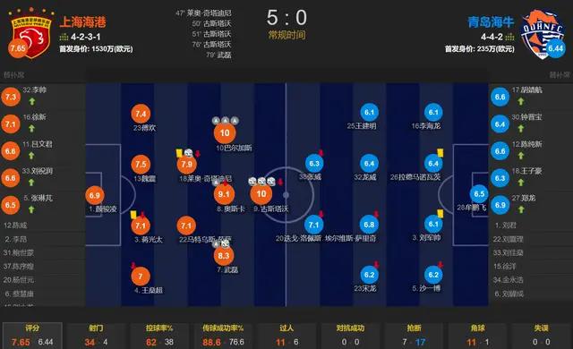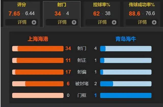 全场比赛,上海海港的控球率为62%,一共有34次射门,其中11次射正;青岛海牛一共仅有4次射门,其中1次射正。